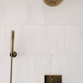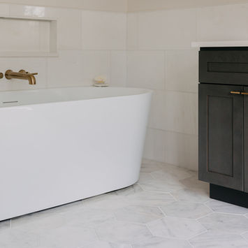 This primary bathroom remodel in Rochester Hills, Michigan blends timeless materials with thoughtful modern detailing. Designed and built by our women-owned design-build team, the space features a custom charcoal vanity with brass hardware, marble countertops, and warm brass plumbing fixtures that add understated elegance. A penny marble tile accent and crisp white wall tile create subtle texture, while natural light enhances the clean, airy feel of the room. As an experienced remodeling contractor serving Oakland County, we focused on creating a bathroom renovation that feels both elevated and functional — maximizing storage, improving layout flow, and delivering craftsmanship built to last. The result is a refined retreat designed for everyday comfort and long-term value.